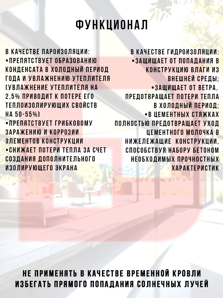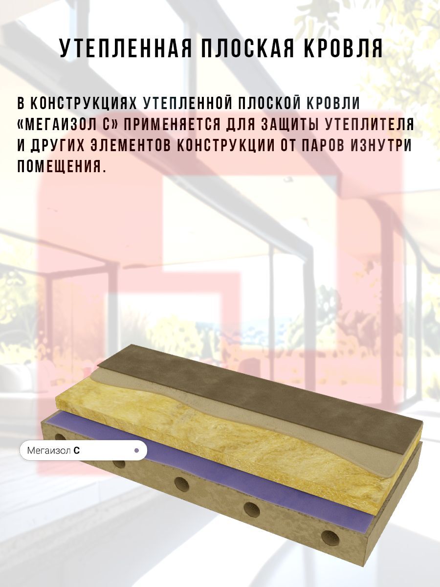 Область применения: утепленные кровли и стены, стяжки для подвальных и цокольных помещений, чердачные перекрытия. Не используйте в качестве временной кровли и защищайте от прямых солнечных лучей.